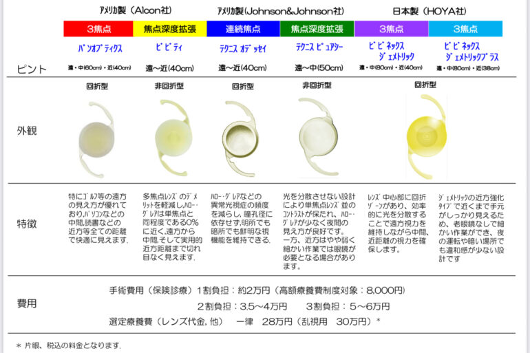 当院で取り扱いしている多焦点眼内レンズ(選定療養)